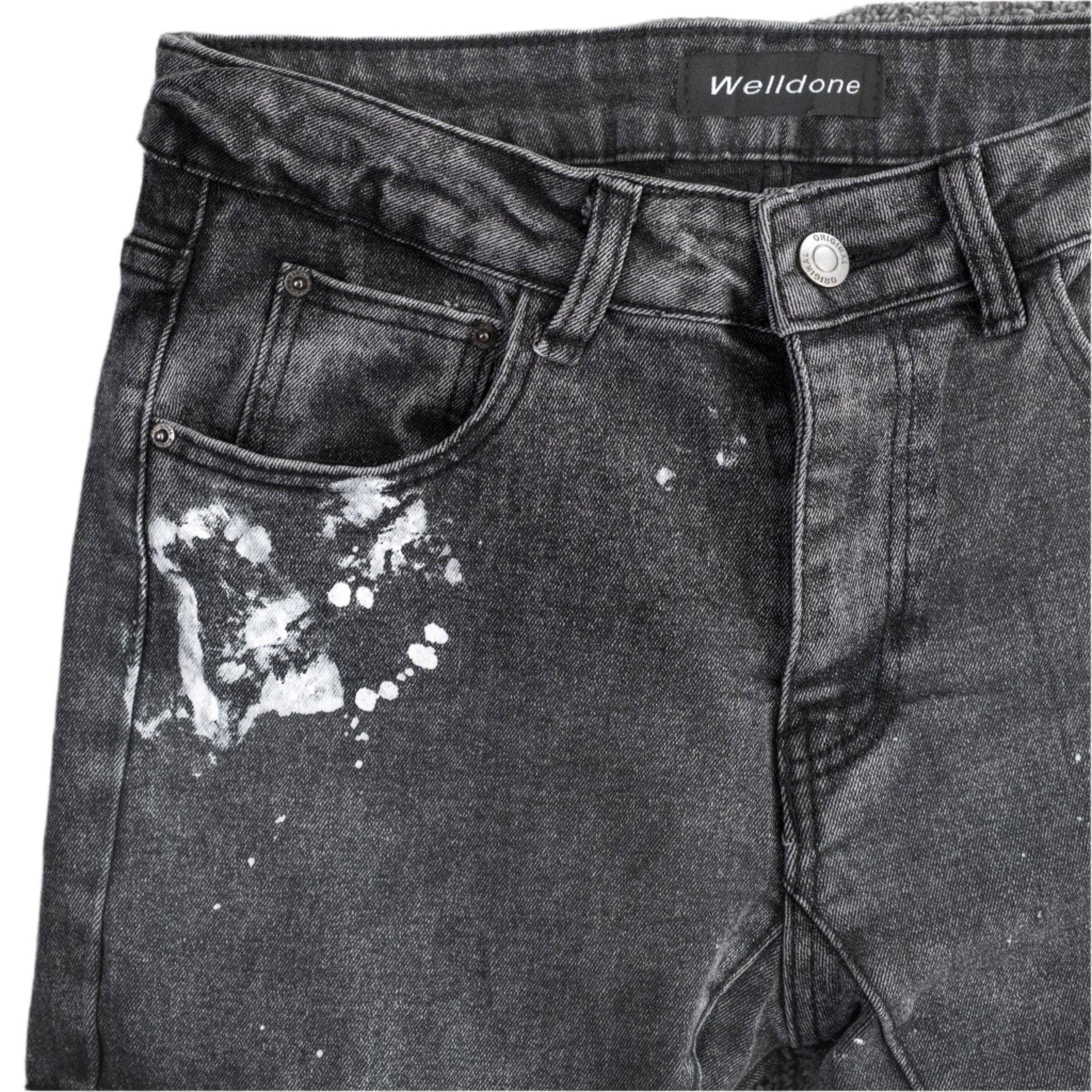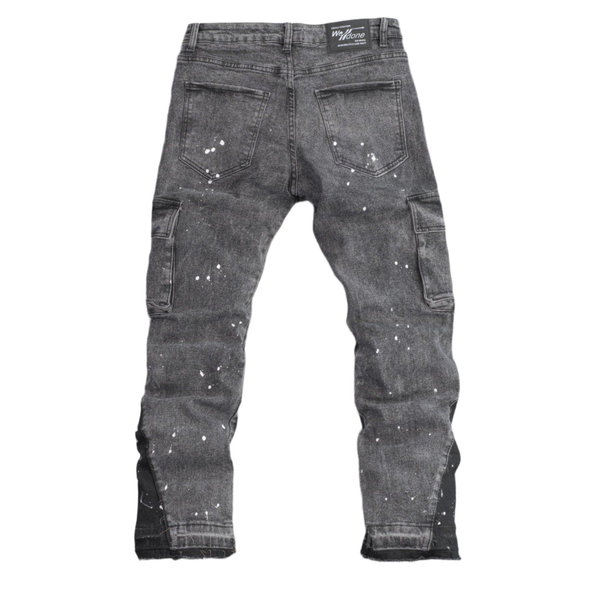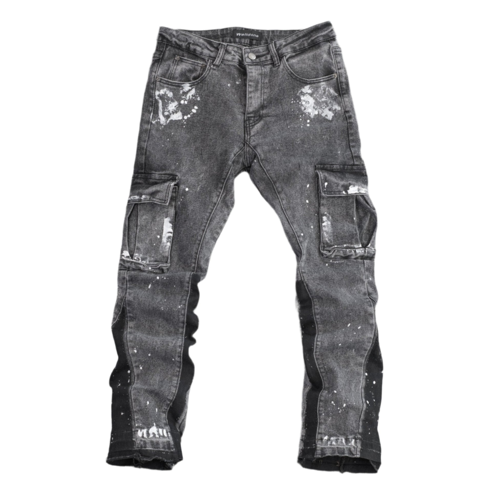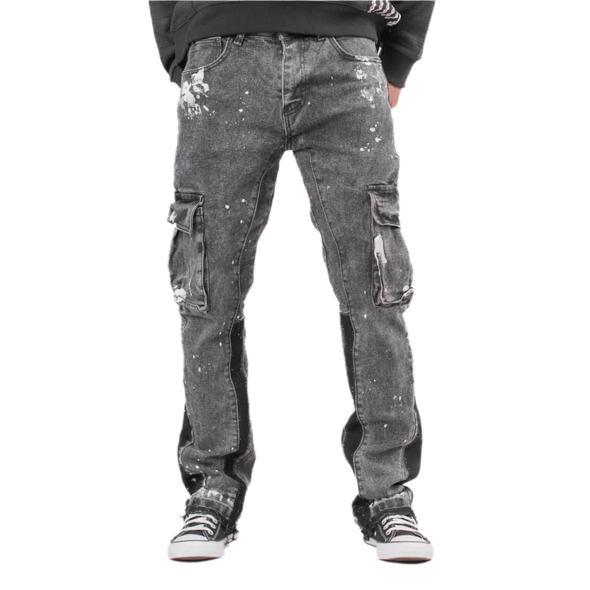 Upgrade your denim collection with these standout cargo jeans. Featuring a black acid wash design with splattered white paint detail for a rugged, streetwear-inspired look. These jeans include spacious cargo pockets on both sides, a distressed raw hem, and tailored skinny fit. Perfect for pairing with sneakers and oversized tees for a casual vibe.