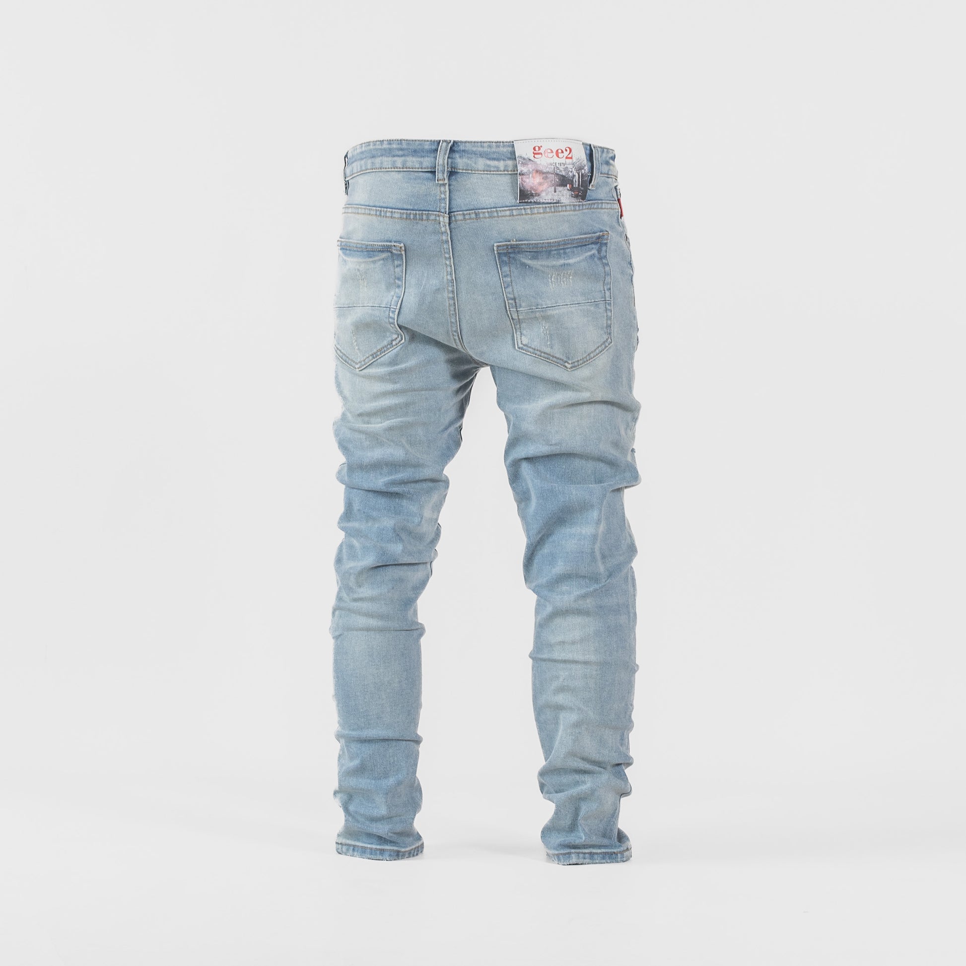 Step into bold street style with the Glacier Fade Distressed Skinny Denim — a light wash jean designed for impact. Featuring heavy ripped and patchwork detailing along the thighs and knees, these jeans bring rugged edge and authentic character to your wardrobe. The skinny fit hugs the legs for a sleek silhouette, while the faded ice-blue tone keeps things fresh and versatile. Ideal for casual statements or pairing with oversized tops and sneakers.