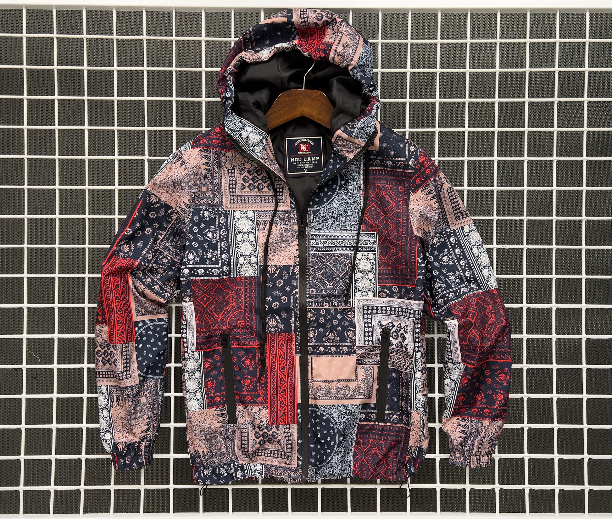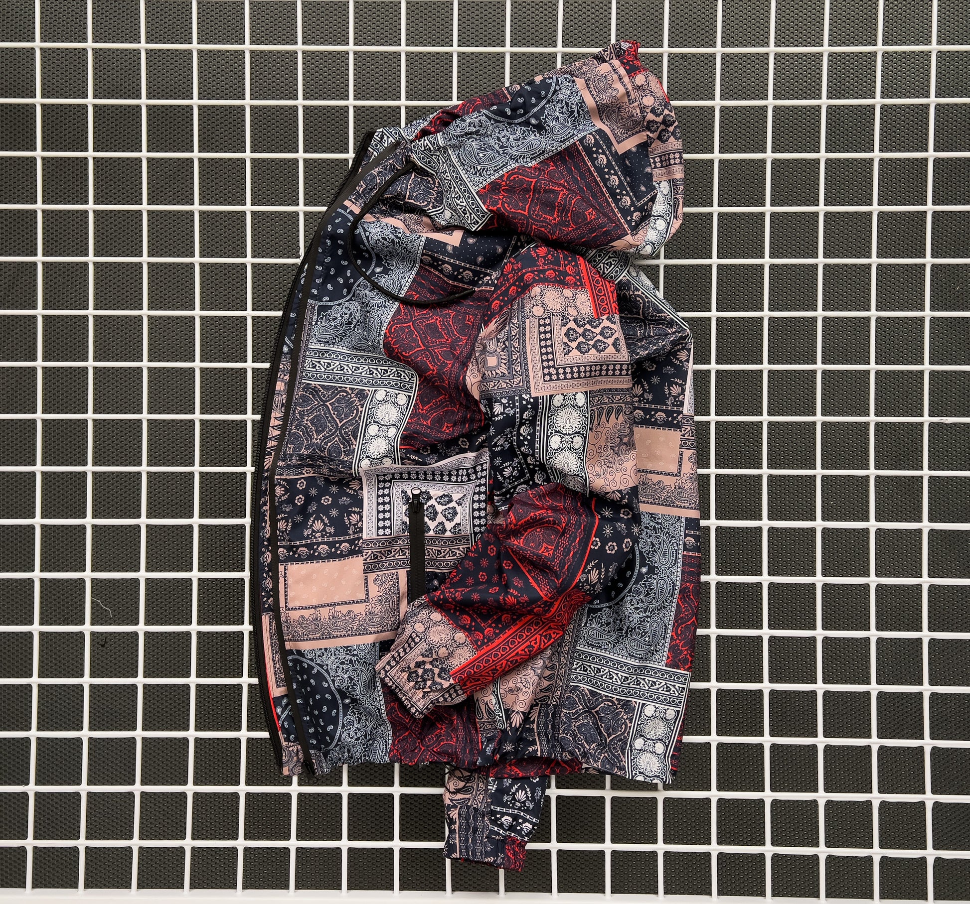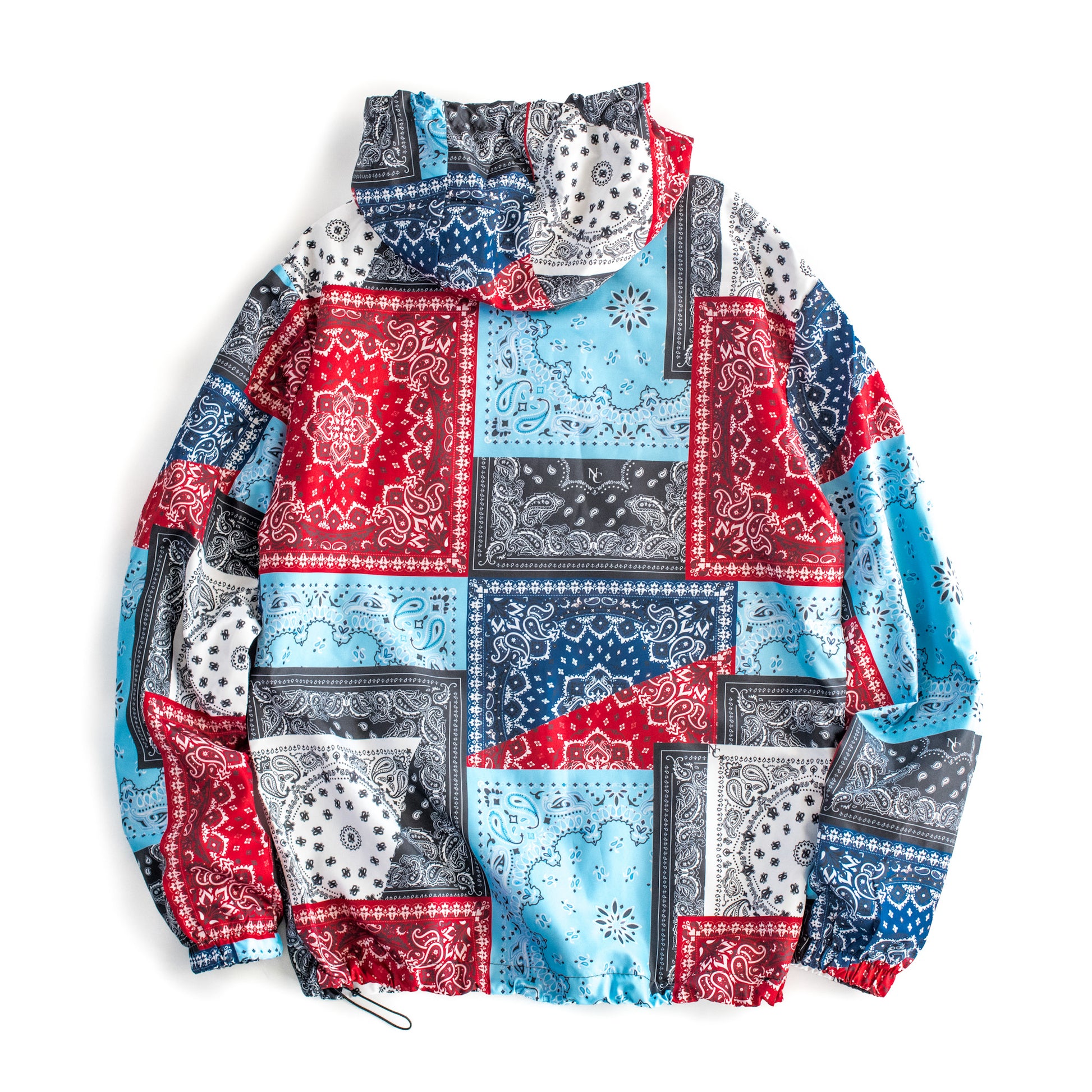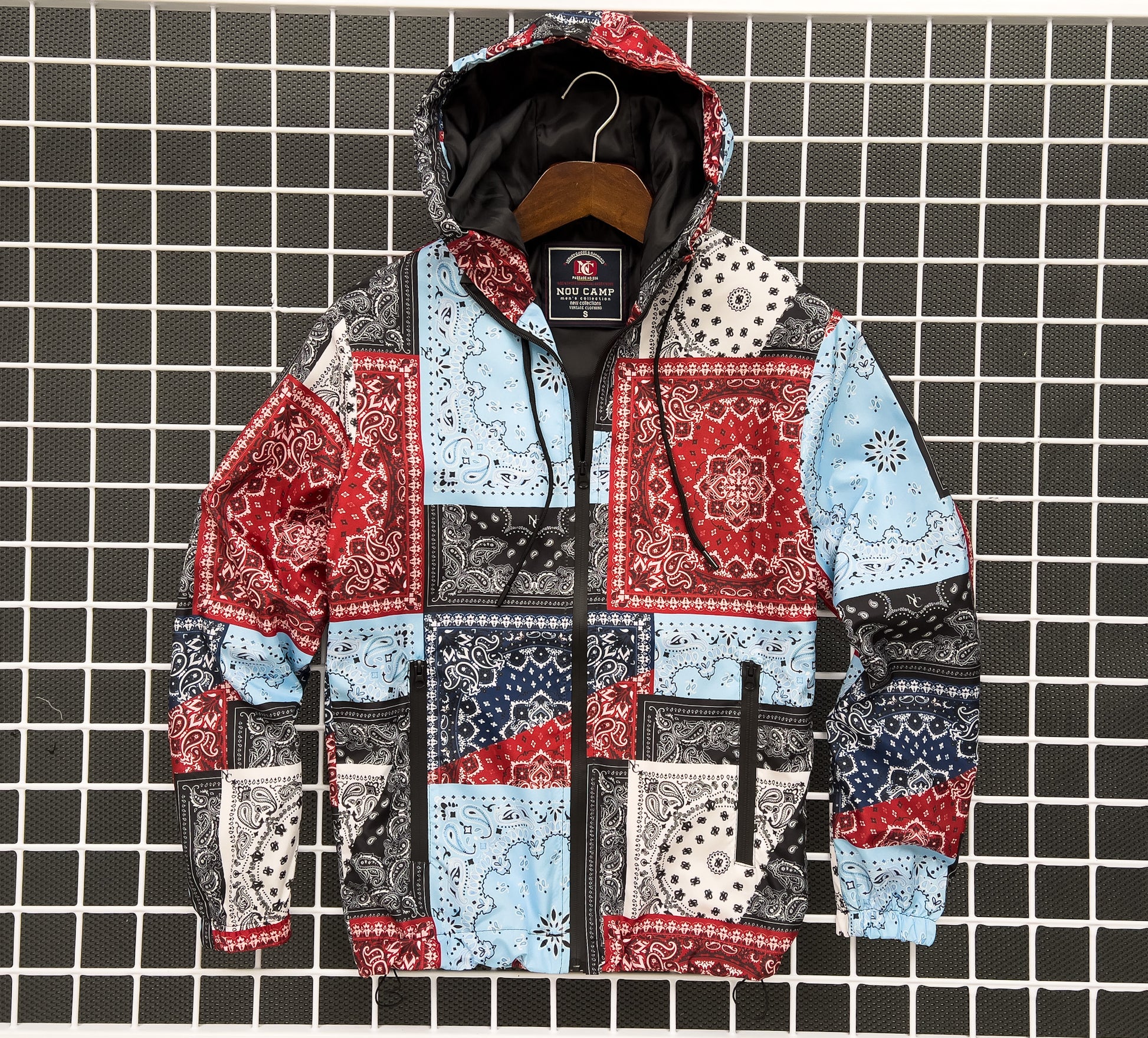 Make a bold statement with the Bandana Patchwork Windbreaker Jacket, a perfect fusion of streetwear and functional fashion. Designed for trendsetters who want to stand out, this lightweight windbreaker features a vibrant patchwork of classic paisley bandana prints in red, blue, black, and white hues. Its water-resistant fabric and adjustable fit ensure comfort and style in any weather.