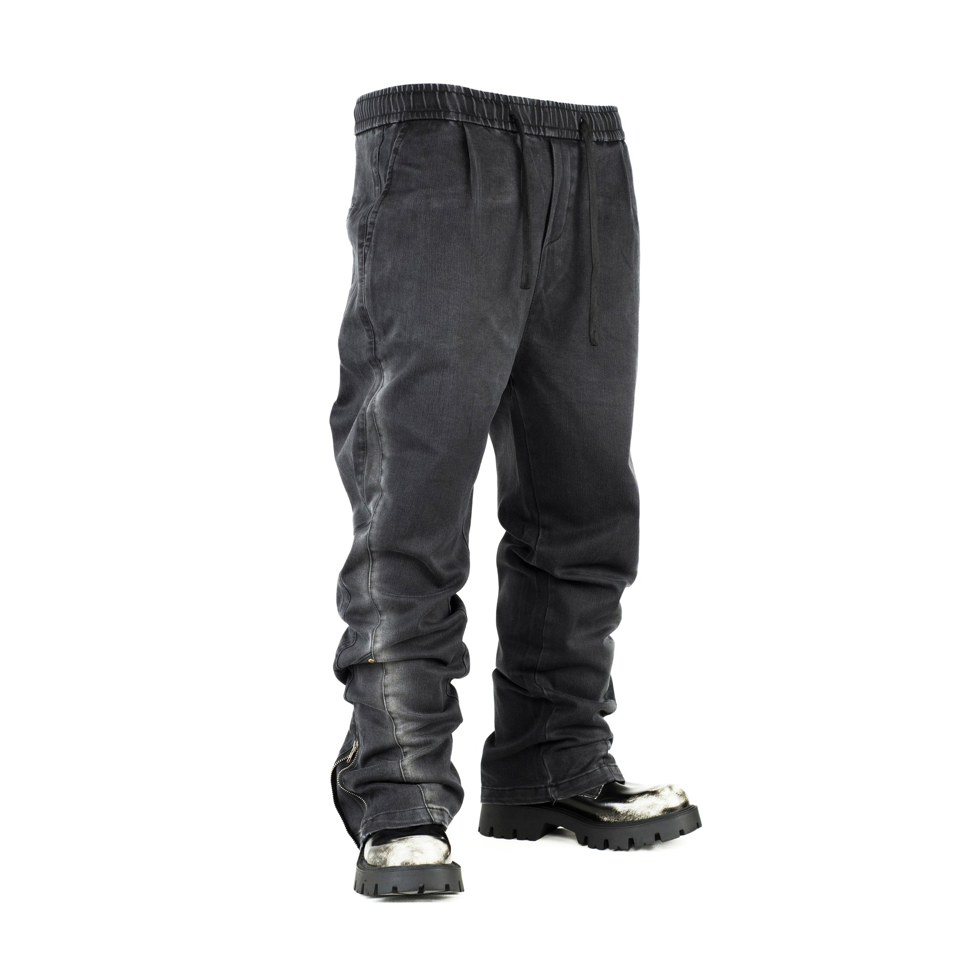 These dark washed denim joggers blend casual comfort with edgy streetwear style. Designed with an elastic waistband and adjustable drawstrings, these pants offer a relaxed fit that’s perfect for everyday wear. The zipper detailing at the ankles adds a unique touch, allowing for versatile styling options. Pair them with rugged boots or sneakers to complete your look. The subtle faded finish gives the pants a worn-in vibe, while the durable denim fabric ensures lasting wear. Ideal for those who appreciate both comfort and style, these joggers can easily transition from casual outings to more adventurous activities.