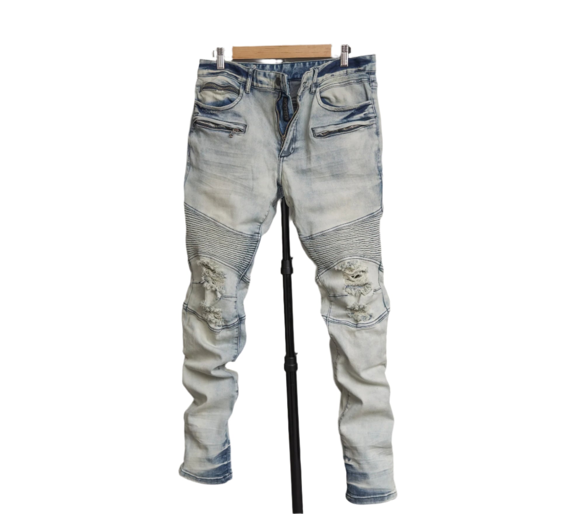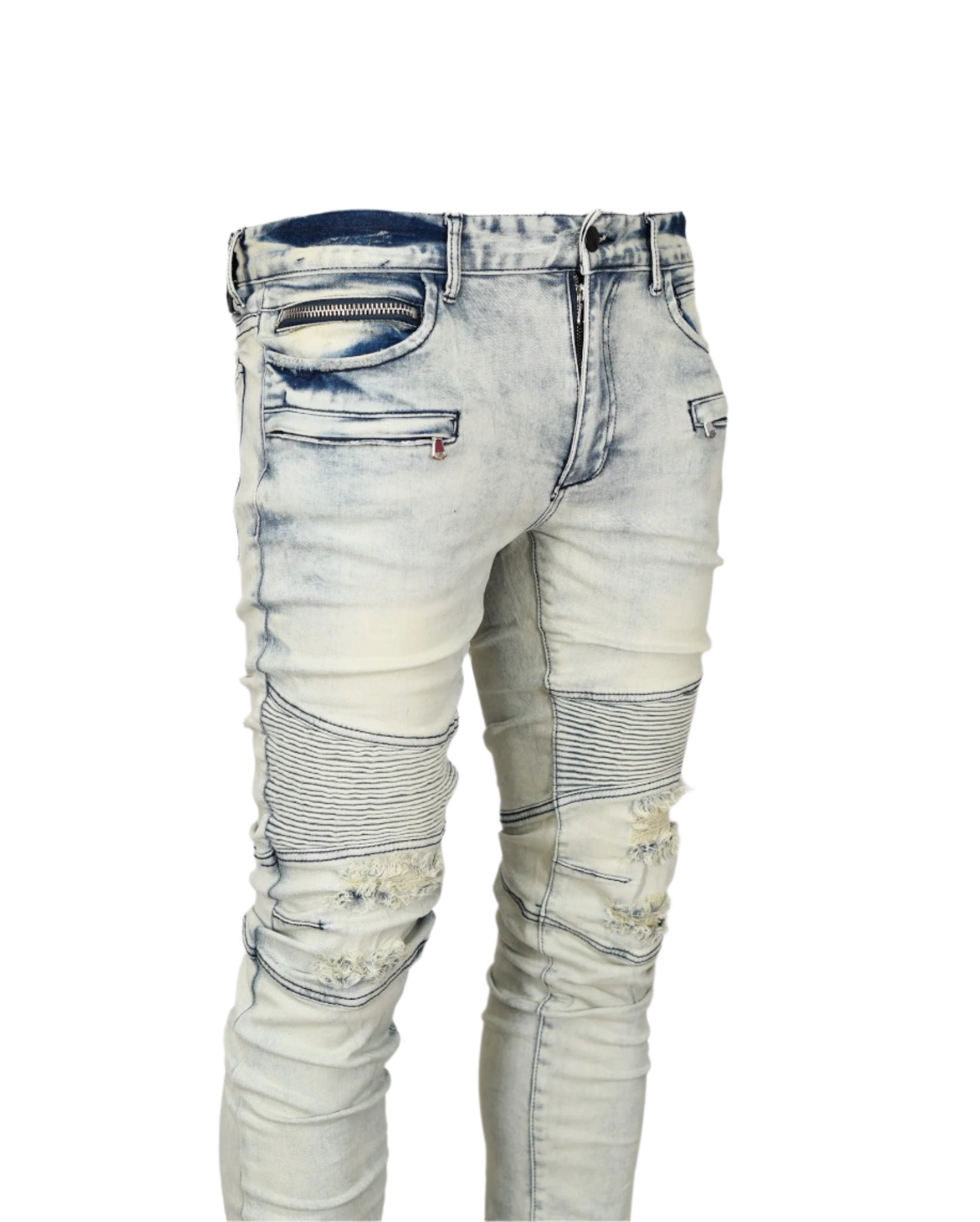 Men Biker dirty wash skinny ripped knee design fashion denim…dirty blue super stretch skinny full length denim…