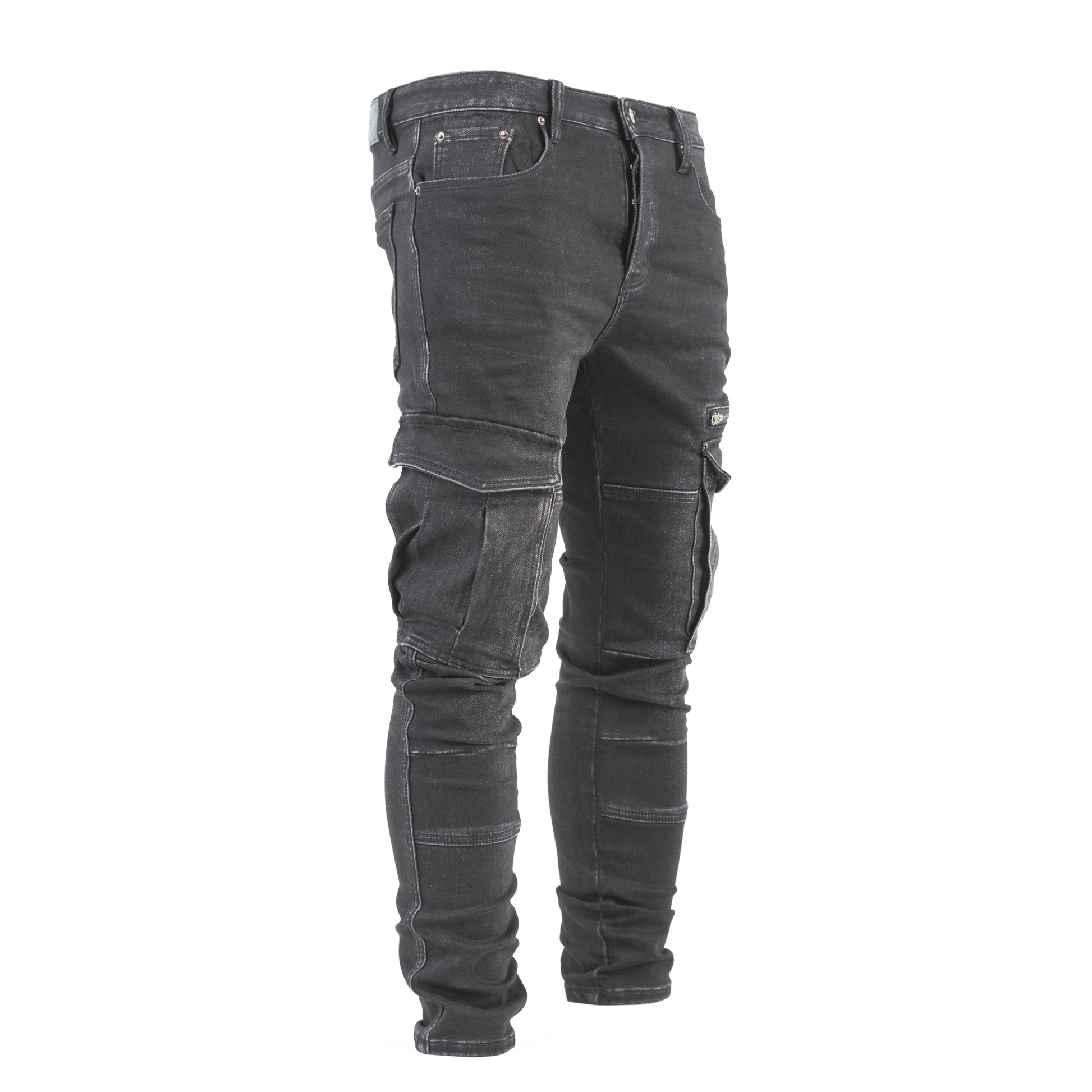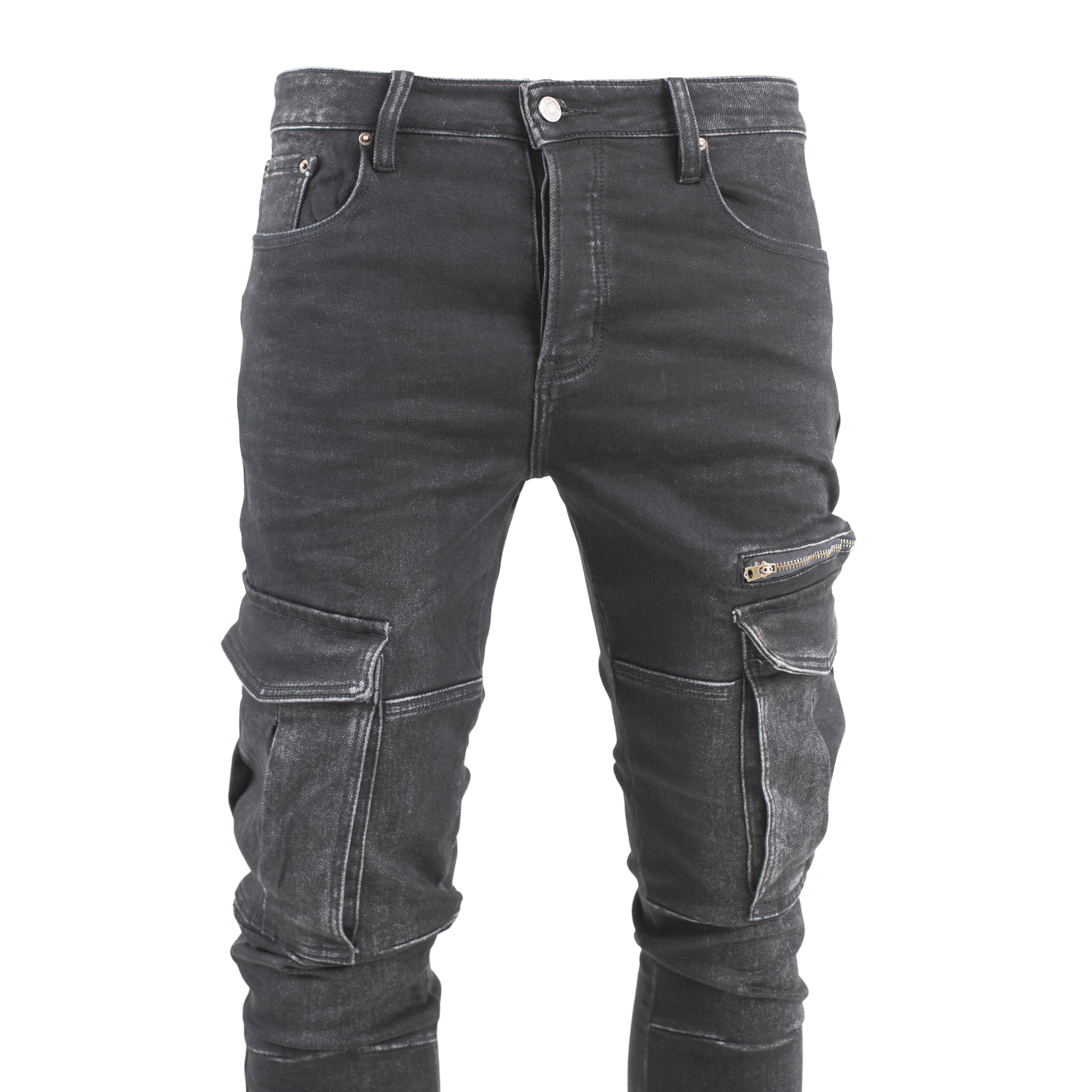 Crafted in a washed charcoal-black denim, these jeans blend a sleek skinny fit with rugged utility detailing for the ultimate urban look.