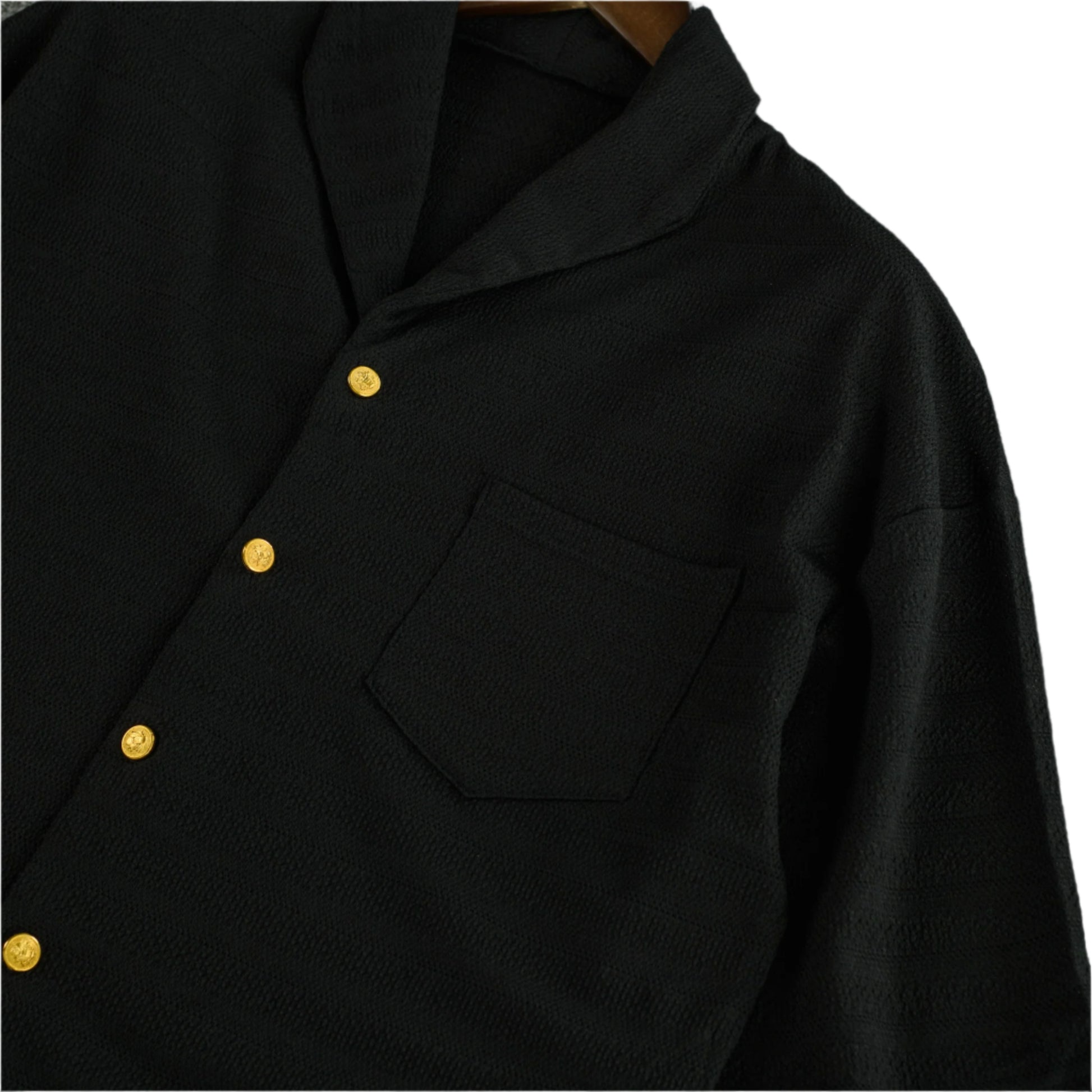 This elegant short-sleeve shirt features a relaxed fit with a unique textured fabric, offering a comfortable and breathable wear. It comes with a classic notched collar and a chest pocket for added style and utility. The highlight of the design is the contrast of the golden buttons, which elevate the look with a sophisticated touch. Perfect for both casual and semi-formal occasions, this shirt is available in classic black and white.