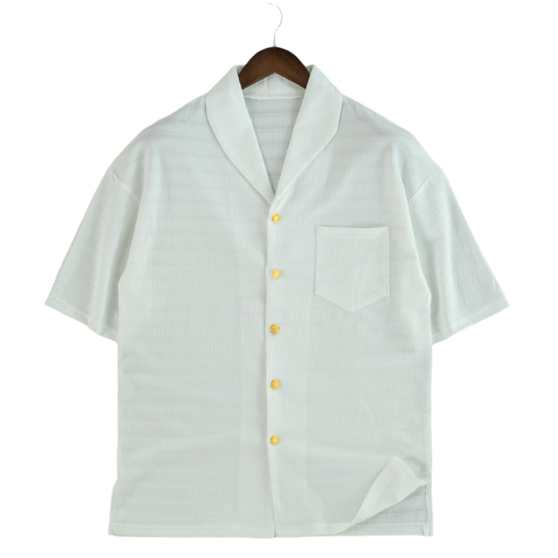 This elegant short-sleeve shirt features a relaxed fit with a unique textured fabric, offering a comfortable and breathable wear. It comes with a classic notched collar and a chest pocket for added style and utility. The highlight of the design is the contrast of the golden buttons, which elevate the look with a sophisticated touch. Perfect for both casual and semi-formal occasions, this shirt is available in classic black and white.