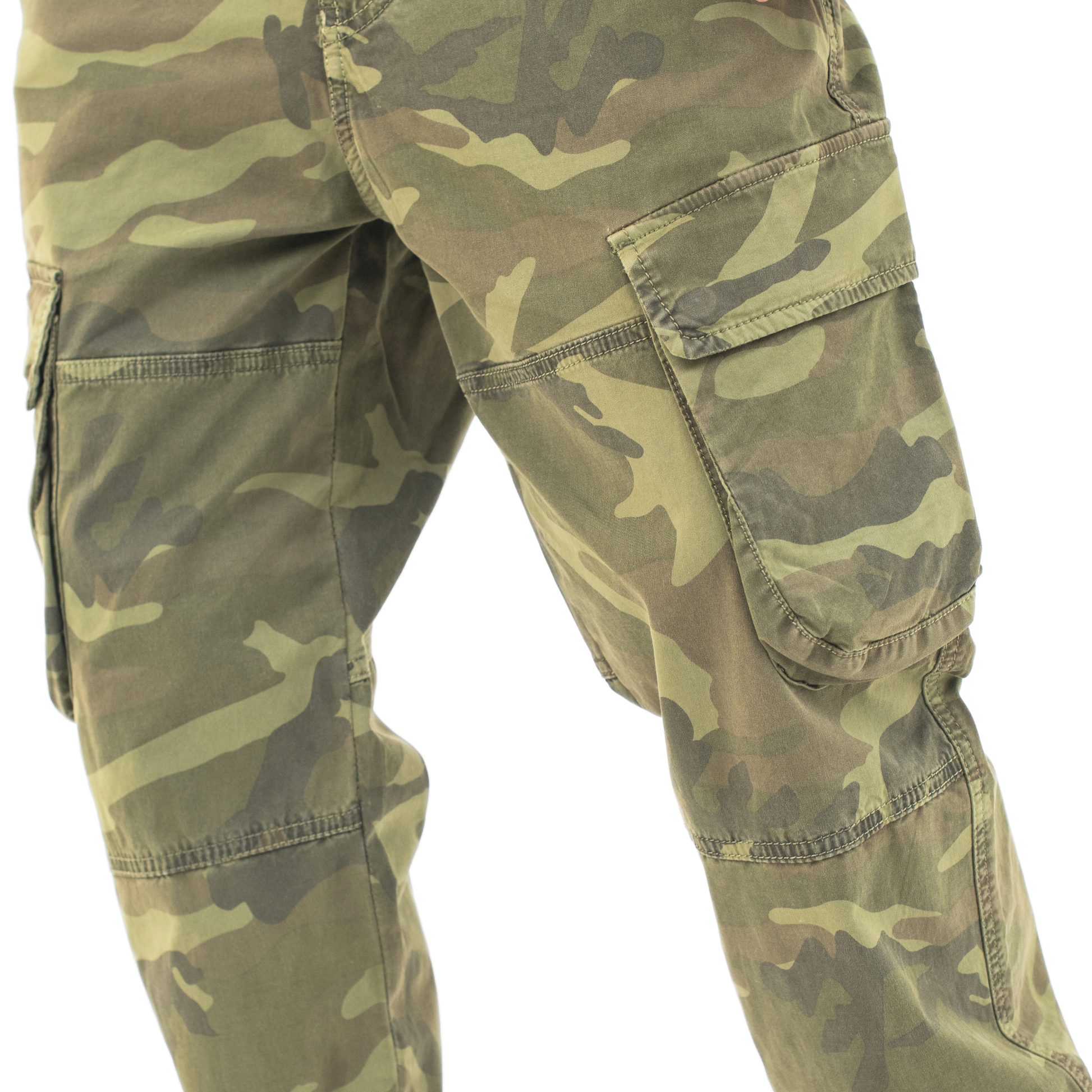 Designed in a classic olive camouflage print, these cargos feature a relaxed straight-leg silhouette with structured panel detailing for added shape and durability. Multiple flap cargo pockets and a rear zip pocket bring both functionality and edge.