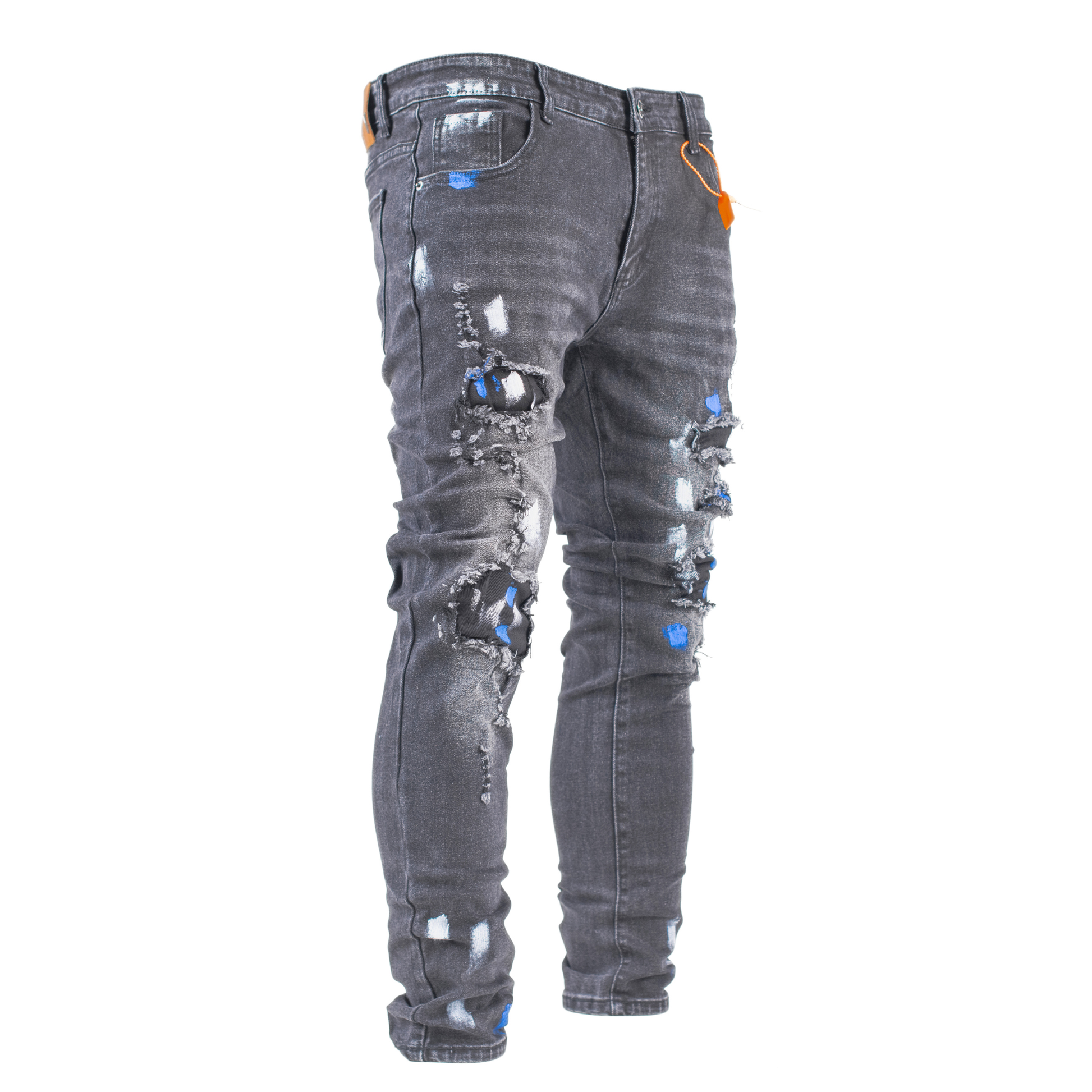 Built on a deep charcoal wash, this jean features aggressive ripped panels layered with frayed textures and electric blue + white paint effects for a raw, artistic edge. The skinny silhouette shapes clean while still giving that rugged, lived-in feel.