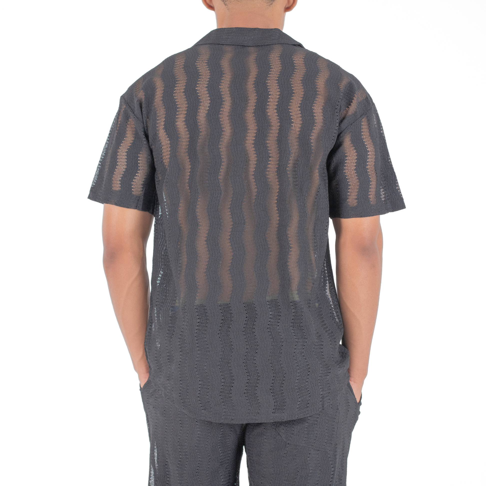 Crafted from a soft open-mesh fabric with a flowing wave pattern, this set delivers the perfect balance between comfort and standout aesthetics. The short-sleeve button-up shirt pairs seamlessly with matching drawstring shorts, giving you a relaxed resort look that still hits streetwear levels.
